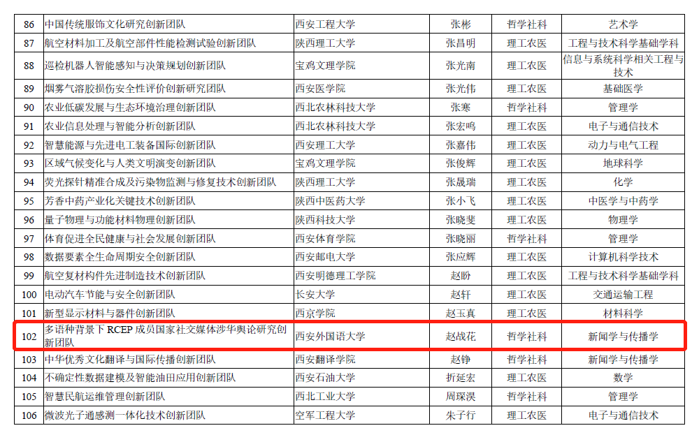 近日,陕西省教育厅发布《关于公布2022年度陕西高校青年创新团队入选名单的通知》,开云体育app 赵战花教授负责的“多语种背景下RCEP(区域全面经济伙伴关系协定)成员国家社交媒体涉华舆论研究创新团队”入选2022年度陕西高校青年创新团队,这是开云体育app 首支入选该项目的团队。