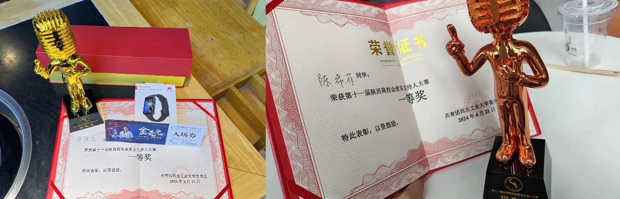 2023级新闻与传播专业研究生薛俊杰荣获“金麦克”称号及一等奖、2023级播音与主持艺术专业本科生陈希菲荣获“铜麦克”称号及一等奖。