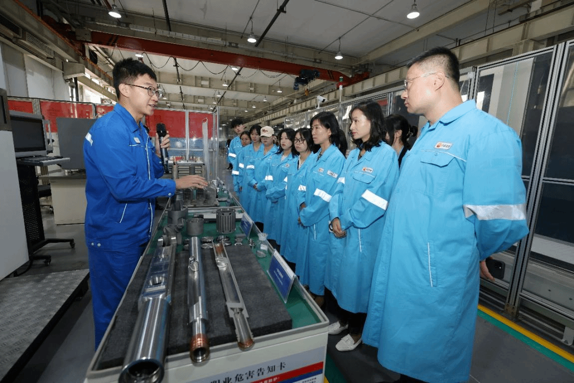 随后,大家移步至产业化工房,深入参观了装备及传感器核心展示区。学生们在讲解员的带领下,近距离接触3D打印设备、智能化加工生产线等高精尖技术。通过互动讲解环节,师生们对中油测井的技术实力和生产流程有了更加全面的体验。