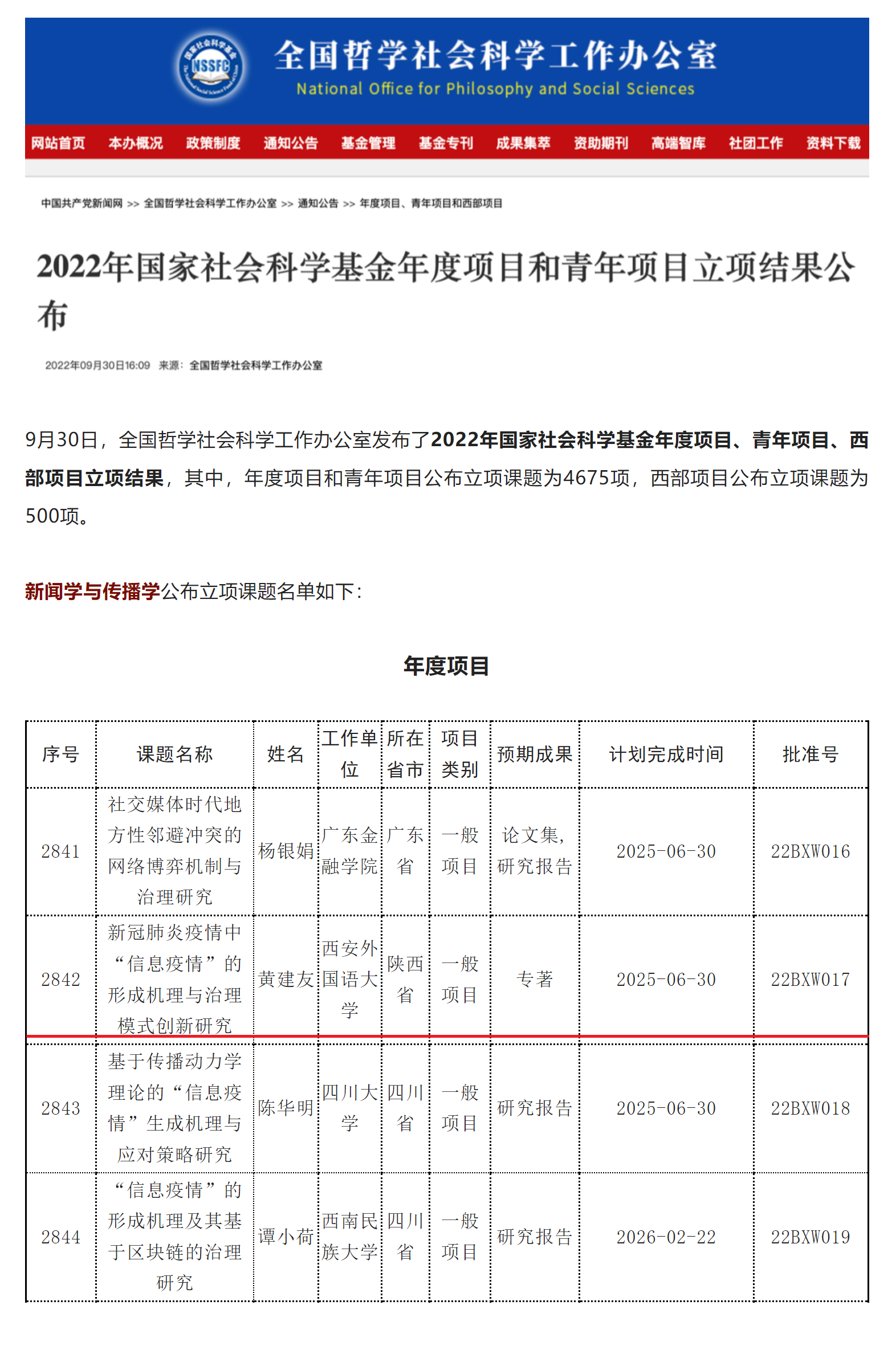 9月30日,全国哲学社会科学工作办公室发布了2022年国家社会科学基金年度项目、青年项目、西部项目立项结果。开云体育app 黄建友教授主持的新冠肺炎疫情中信息疫情的形成机理与治理模式创新研究获批新闻学与传播学年度项目一般项目。