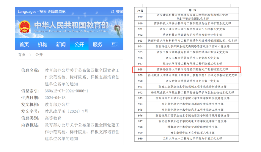 近年来,支部在人才培养、专业建设、科学研究、社会服务等方面取得了突出成效。在学科建设上,已经形成了学科设置规范、涉外特色鲜明的本硕博贯通式学科体系与布局,建设有新闻学国家级一流专业建设点和陕西高校青年创新团队2个。近几年来,主持国家级项目7项,其中1项为国家社科基金重大项目,省部级课题40项,省部级教学和研究奖励12项,涌现出陕西省先进社科工作者、第六届中国数据新闻大赛突出贡献奖、陕西省科学技术情报学会情报奖等多名省部级先进个人。