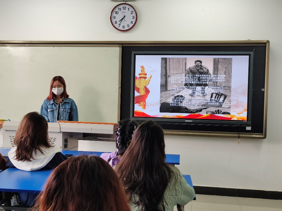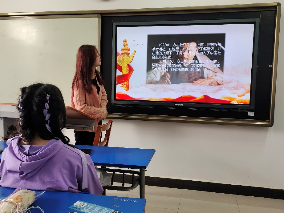 最后,心理委员周碧丽同学向大家讲述了方志敏被捕入狱,以身殉职的故事。她说:“方志敏同志用热血和生命铸就了永恒的丰碑。他在狱中的遗著,也成为党和人民宝贵的精神财富。”并带领大家观看方志敏在狱中写下的著作《可爱的中国》诗歌朗诵视频。周碧丽同学指出:“英雄已逝,精神永存。方志敏赤诚的爱国之心和崇高的理想追求永远值得我们致敬和学习。”