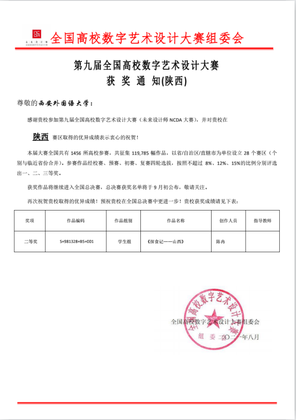 全国高校数字艺术设计大赛(未来设计师NCDA大赛)由工业和信息化部人才交流中心主办,NACG数字艺术人才培养工程办公室与未来设计师云承办,本届大赛全国共有1456所高校参赛,共征集119,785幅作品,以省/自治区/直辖市为单位设立28个赛区(个别省份与邻近省份合并)。大赛按照不超过8%、12%、15%的比例分别评选出一、二、三等奖,是全国大学生积极参与、具有广泛影响力的专业赛事之一,成为大学生积极参与设计创新活动的重要平台。