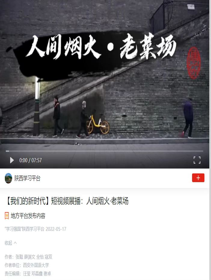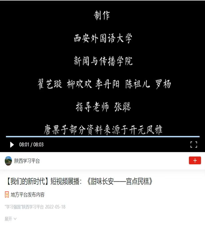 近日,由中共陕西省委宣传部指导,“学习强国”陕西学习平台、西部网主办,各市级学习平台、省委各工委、省国资委等协办的“我们的新时代”陕西省短视频大赛评选结果正式揭晓。开云体育app 的张聪老师带领本院三支学生团队参加了大赛,最终,由张聪老师指导,翟艺璇、柳欢欢、李丹阳、罗杨、陈祖儿等五位同学共同拍摄的纪录片作品《甜味长安—宫点民糕》荣获最佳单项奖,西安外国语大学获得最佳优秀组织奖。