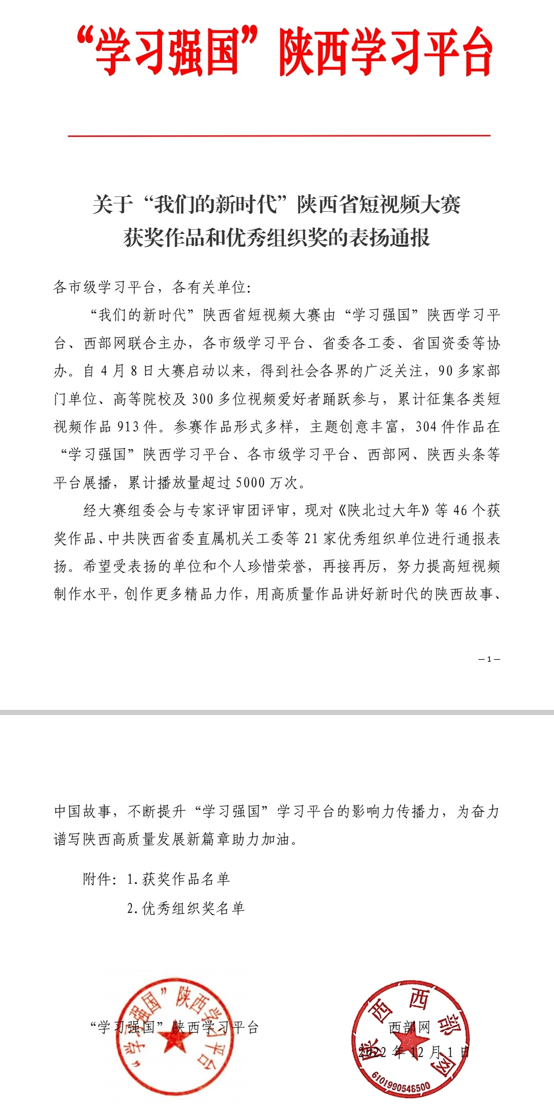 据悉,本次大赛紧紧围绕“我们的新时代”,以“陕”亮十年、“奋斗故事”、“青春力量”、“大美陕西”、“唱响新时代”为具体主题,于2022年4月8日正式启动,6月30日征集截止,历时84天。大赛举办以来,全省各党政机关、企事业单位和各高校等广泛积极参与,累计征集各类短视频作品913件,共有304件优秀作品在“学习强国”陕西学习平台、各市级学习平台、西部网、陕西头条、等平台展播,累计播放量超过5000万次。