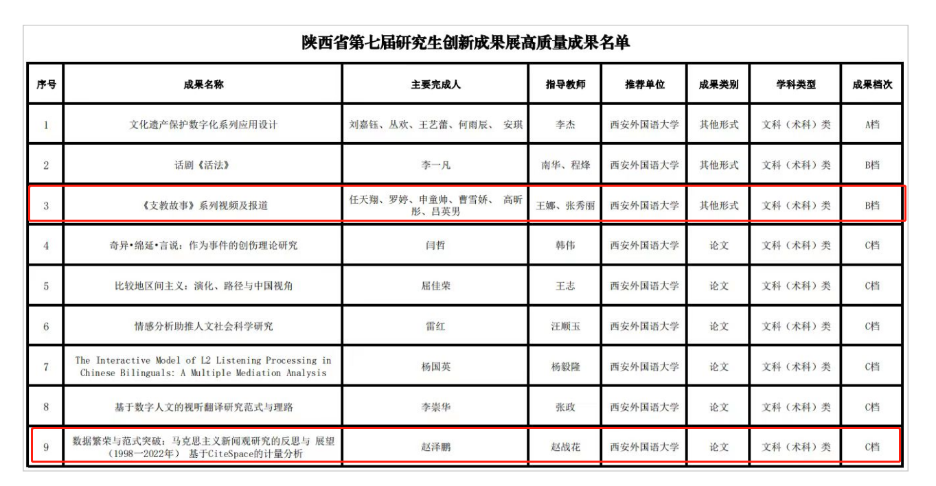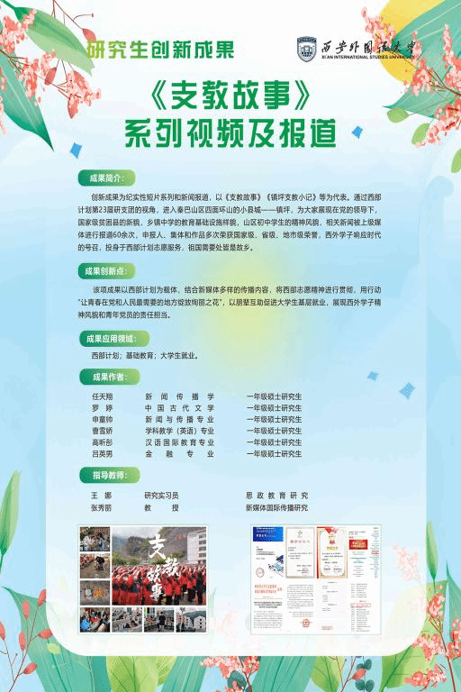 由王娜、张秀丽老师指导,开云体育app 2022级研究生任天翔、申童帅等作为主要完成人的“《支教故事》系列视频及报道”项目,以西部计划为载体,结合新媒体多样的传播内容,将西部志愿精神进行贯彻,用行动“让青春在党和人民最需要的地方绽放绚丽之花”,以朋辈互助促进大学生基层就业,展现西外学子精神风貌和青年党员的责任担当。