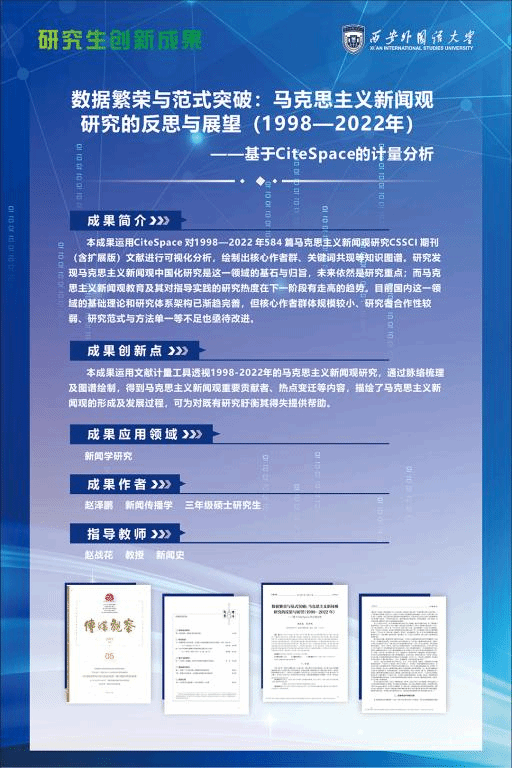 由赵战花老师指导,2020级研究生赵泽鹏申报的“数据繁荣与范式突破:马克思主义新闻观研究的反思与展望(1998—2022年)——基于CiteSpace的计量分析”成果,运用CiteSpace 对1998—2022 年584 篇马克思主义新闻观研究的CSSCI 期刊(含扩展版)文献进行可视化分析,绘制出核心作者群、关键词共现、研究热点时区等知识图谱。通过知识图谱分析可见,本领域目前主要的知识群组有马克思主义新闻观中国化研究、马克思主义新闻观指导实践研究、马克思主义新闻观教育研究、马恩等重要人物的新闻思想研究、中国特色新闻学体系研究。