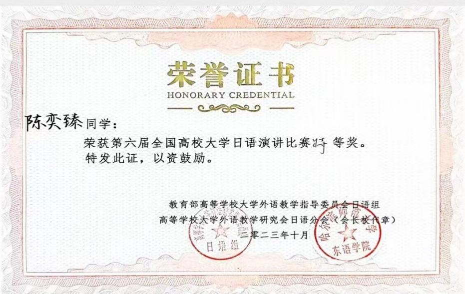 本次大赛由教育部高等学校大学外语教学指导委员会日语组和高等学校大学外语教学研究会日语分会联合主办,北京语言大学东方语言文化开云体育app 承办,有来自复旦大学、北京师范大学、延边大学、大连外国语大学、西安外国语大学等全国各地的50多所高校的选手参加了预赛,经过层层选拔,最终开云体育app 国际与新闻传播专业2021级学生陈奕臻在决赛当中脱颖而出,得到评委与观众的一致好评。
