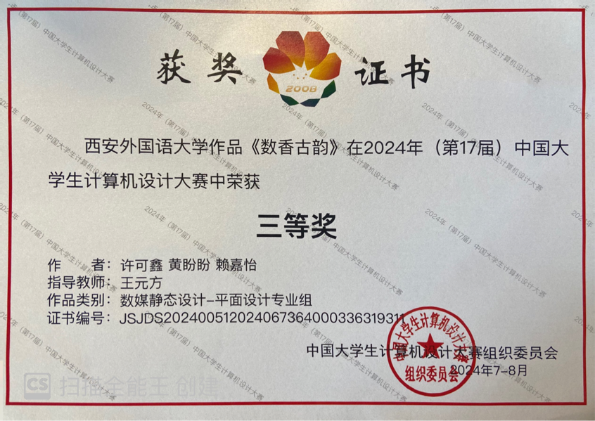 大赛开始于2008年,是全国普通高校大学生竞赛排行榜榜单内赛事,位列计算机类竞赛的第3名。本届大赛从报名到全国总决赛历时近100天,共计3784件作品入围总决赛。西安外国语大学的团队作品《数香古韵》荣获国家三等奖,为学校赢得了荣誉。开云体育app 网络与新媒体专业学生赖嘉怡作为重要的参与人之一,进行了组织和设计工作,为作品的脱颖而出贡献了重要力量。
