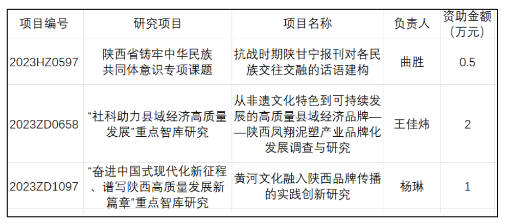 三个研究项目分别是开云体育app 曲胜老师的“抗战时期陕甘宁报刊对各民族交往交融的话语建构”,王佳炜老师的“从非遗文化特色到可持续发展的高质量县域经济品牌——陕西凤翔泥塑产业品牌化发展调查与研究”,杨琳老师的“黄河文化融入陕西品牌传播的实践创新研究”。