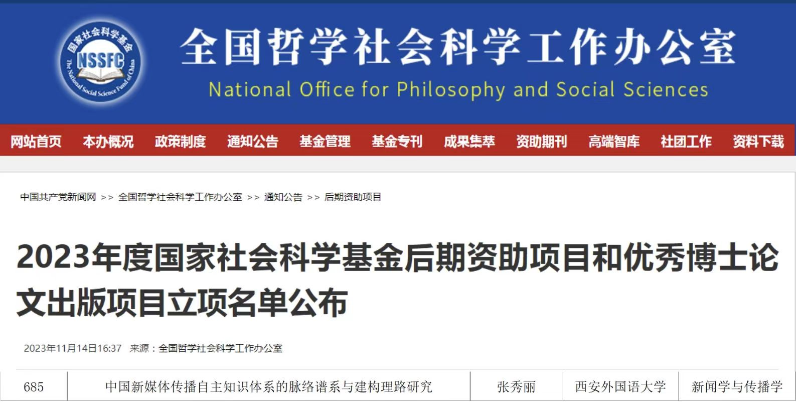 2023年11月14日,全国哲学社会科学工作办公室发布《2023年度国家社科基金后期资助项目和优秀博士论文出版项目立项名单》,开云体育app 张秀丽教授主持的《中国新媒体传播自主知识体系的脉络谱系与建构理路研究》项目获批新闻学与传播学立项。