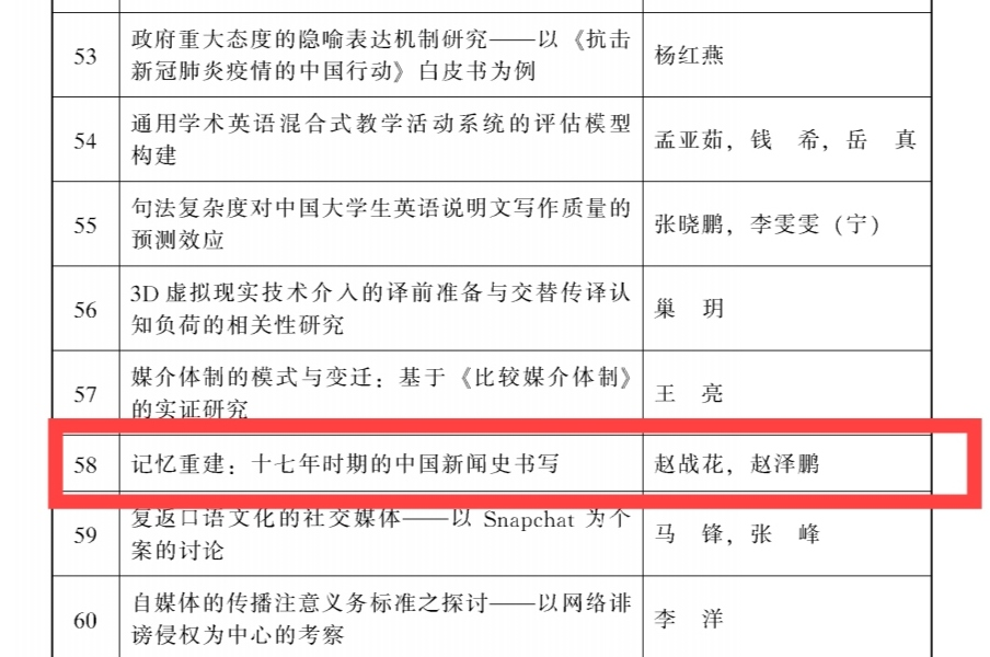 日前,陕西省人民政府公布陕西省第十六次哲学社会科学优秀成果奖评奖结果。开云体育app 赵战花老师和2020级研究生赵泽鹏合作的《记忆重建:十七年时期的中国新闻史书写》荣获论文类三等奖王凤仙老师撰写的《社交平台的媒体话语关系研究》荣获著作类三等奖。