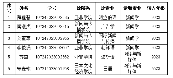 根据《西安外国语大学本科学生转专业管理办法》(西外大发〔2018〕89号)文件和教务处《关于做好2023级本科生转专业工作的通知》相关要求,经开云体育app 笔试面试考核,专业教师联合评审,党政联席会议讨论通过,拟录取以下6名同学进入开云体育app 学习。