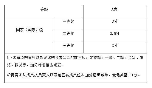 认定范围仅限作为主力成员参加与学业相关的国内权威学科竞赛(全国赛)并获得三等奖及以上奖励(国际赛事参照执行,但不得低于国内赛事相关要求)。所计分数依照学校发布认定的全国大学生学科竞赛项目类别执行,具体计分标准如下: