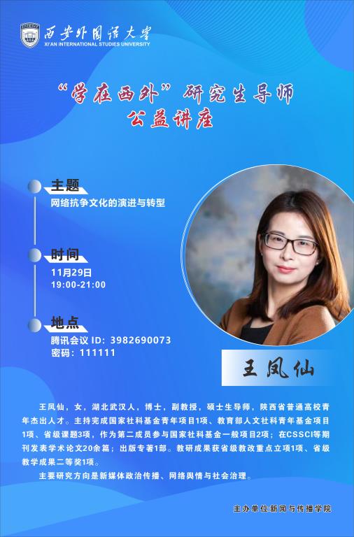 题 目:“学在西外”研究生导师公益讲座:网络抗争文化的演进与转型